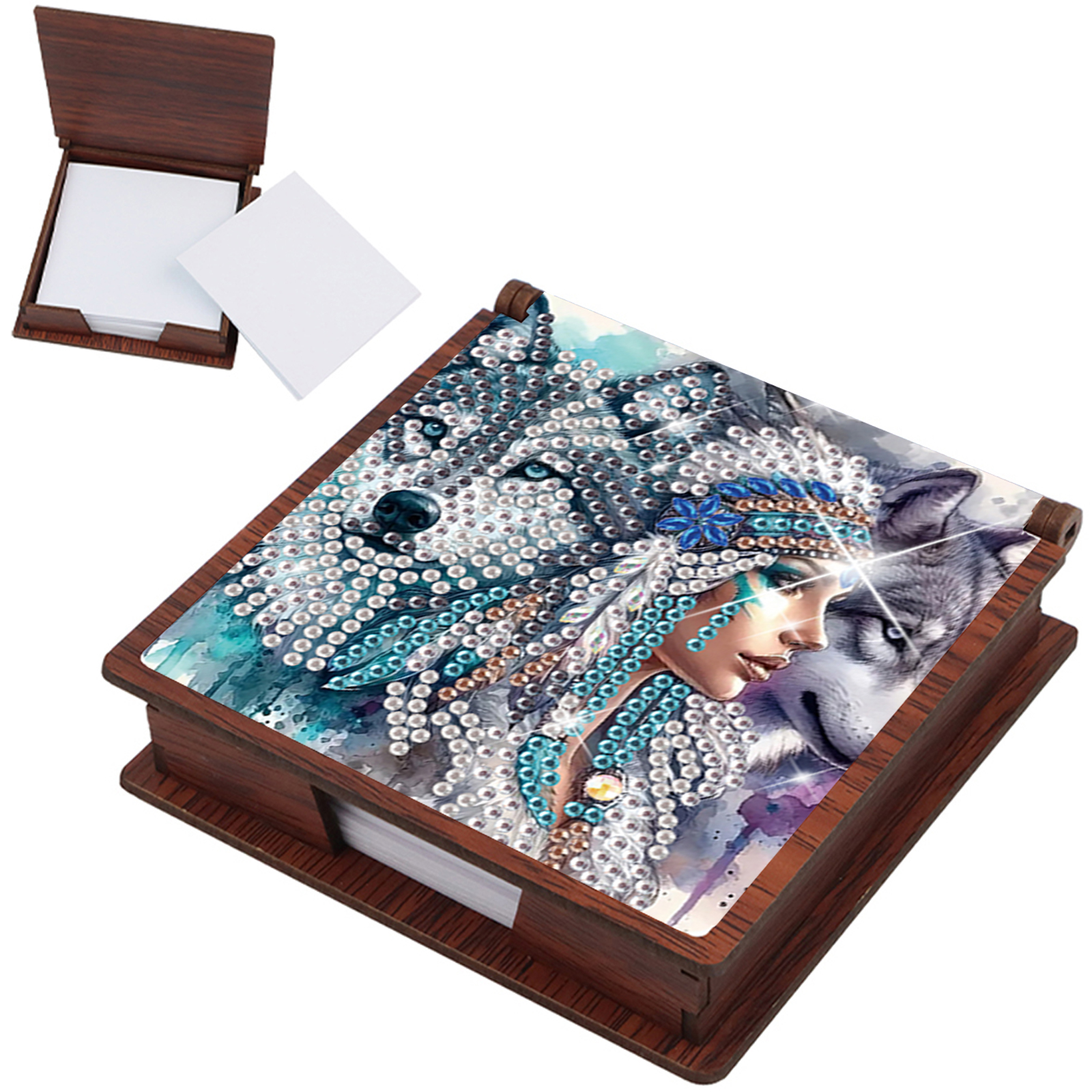 Wooden DIY Indian Wolf Diamond Painting Kit Note Box with 160 Papers for Office